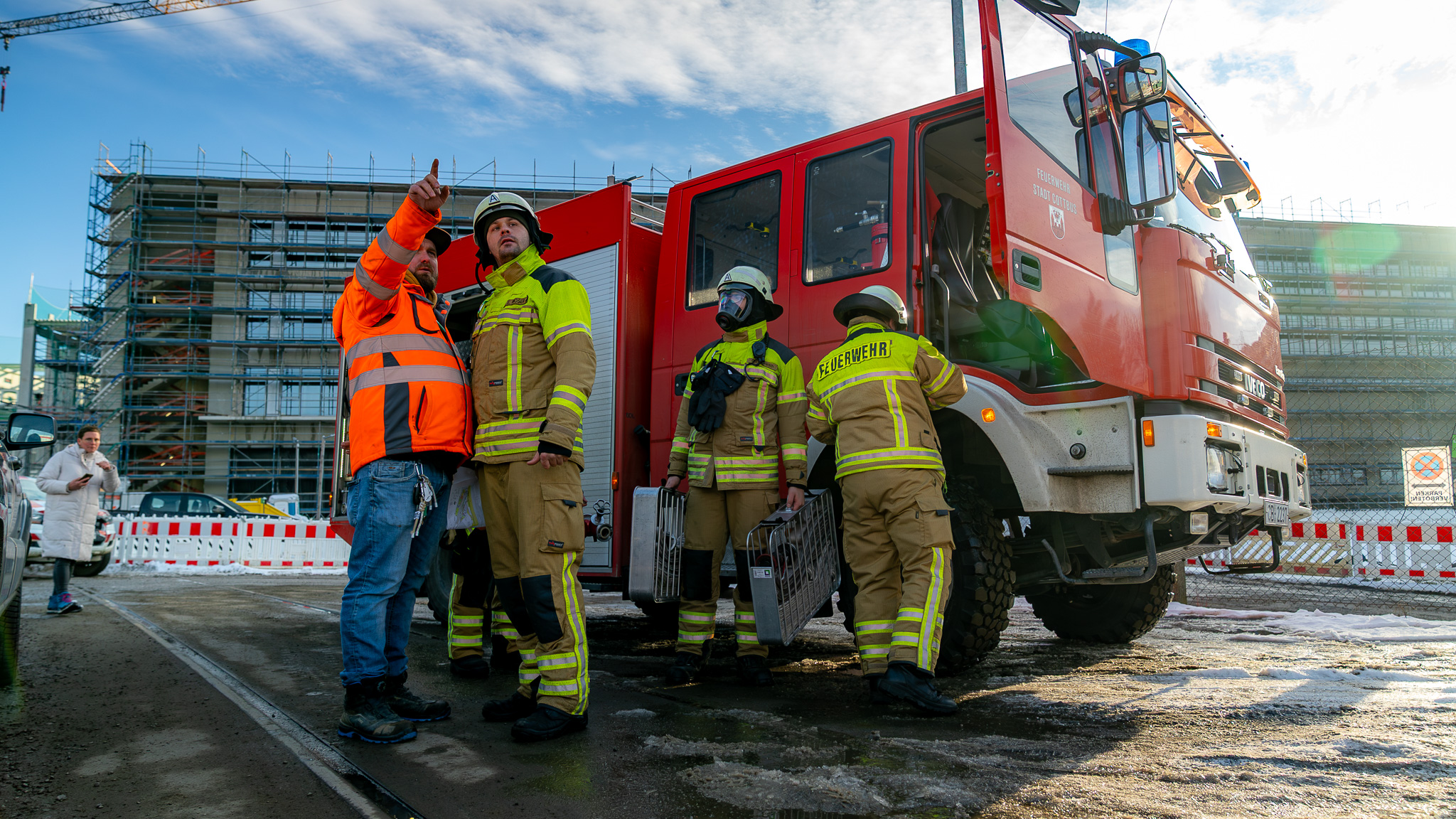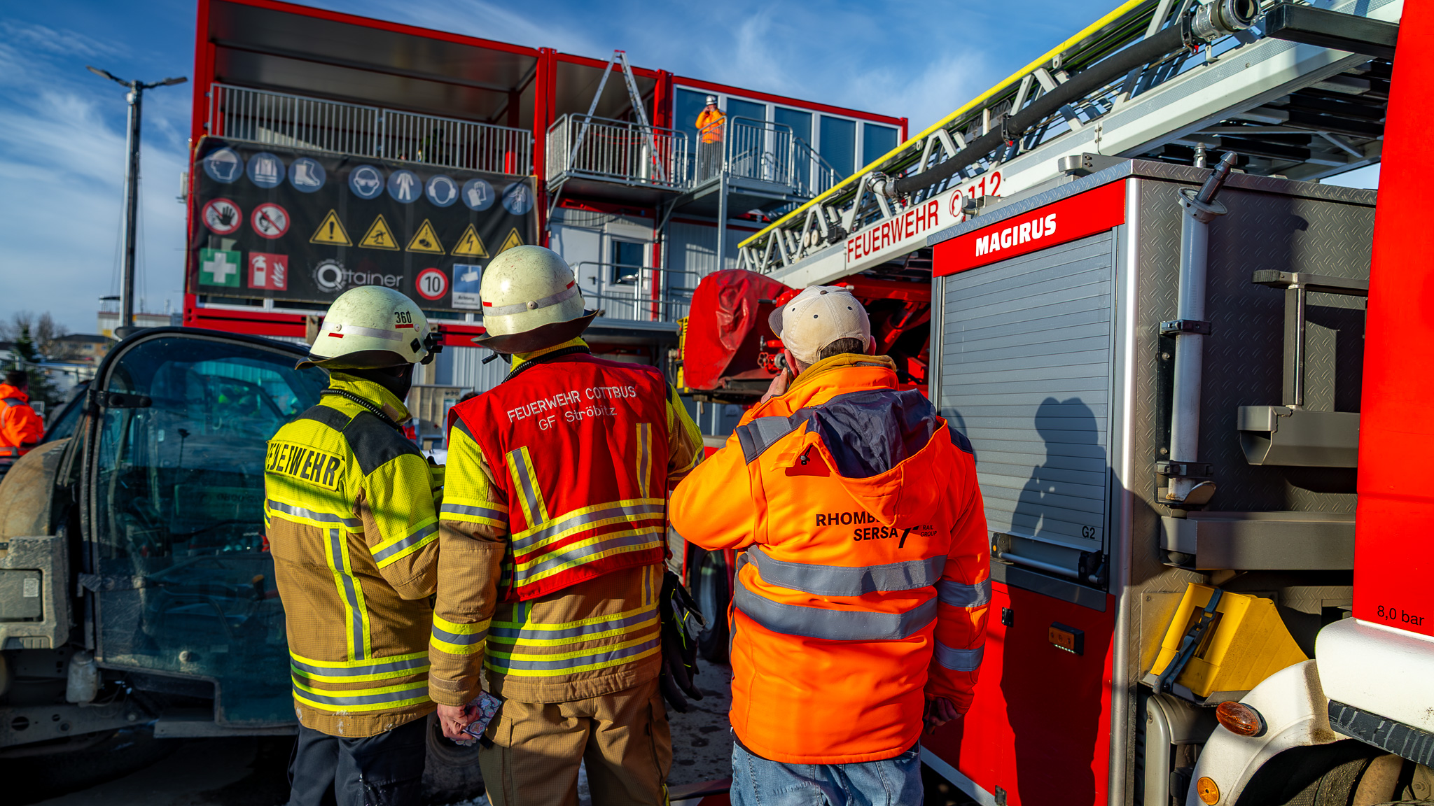 Auf dem Gelände des neuen DB-Werkes fand heute eine umfangreiche Feuerwehrübung statt. Trainiert wurde ein Brandeinsatz in einem Bürocontainer, ausgelöst durch einen angenommenen technischen Defekt. Im Übungsszenario mussten mehrere vermisste Personen gerettet sowie ein simulierte Atemschutznotfall bewältigt werden.